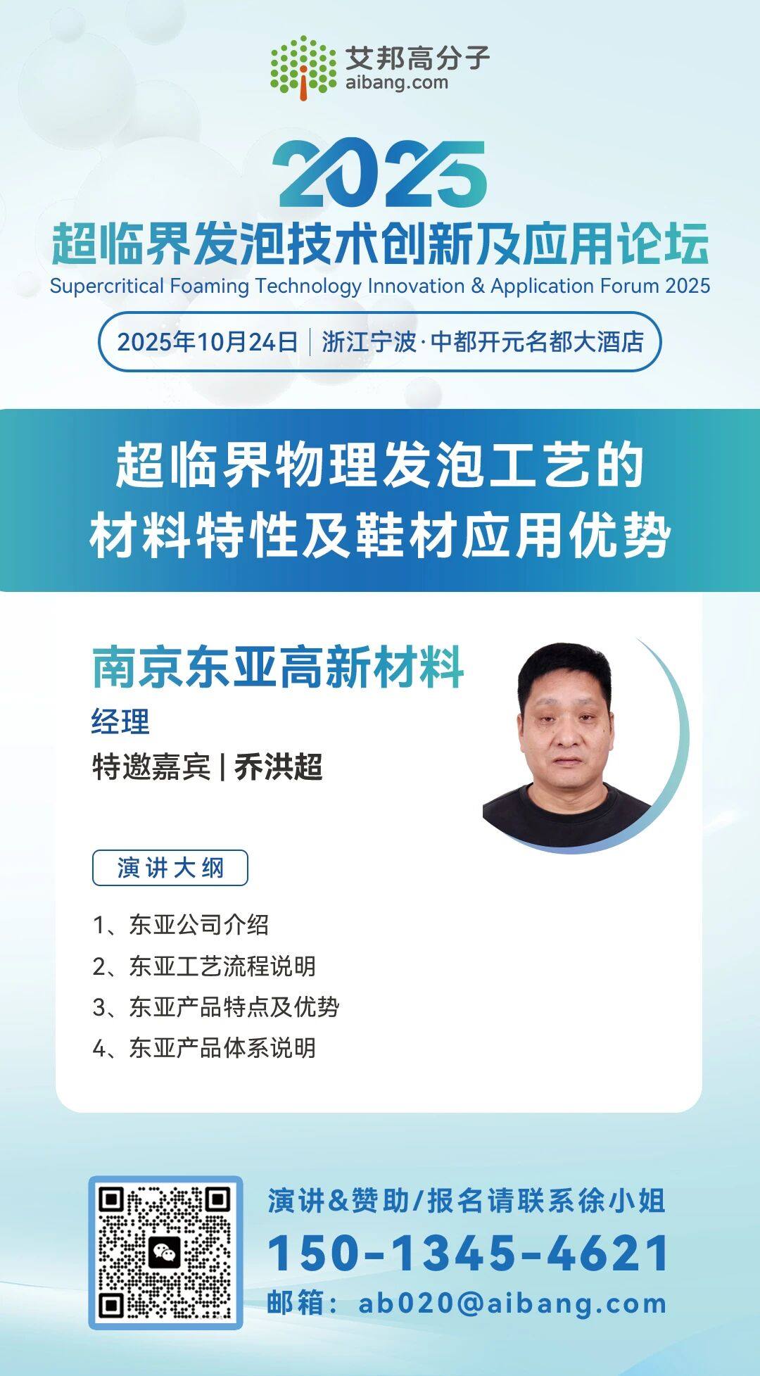 10月24日,南京东亚高新材料有限公司 经理 乔洪超将作为演讲嘉宾出席超临界发泡技术创新及应用论坛,并做《超临界物理发泡工艺的材料特性及鞋材应用优势的主题演讲。